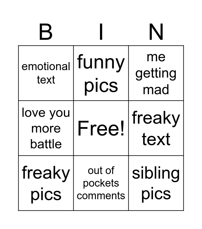 This bingo card has a free space and 8 words: freaky text, me getting mad, funny pics, freaky pics, emotional text, sibling pics, love you more battle and out of pockets comments.