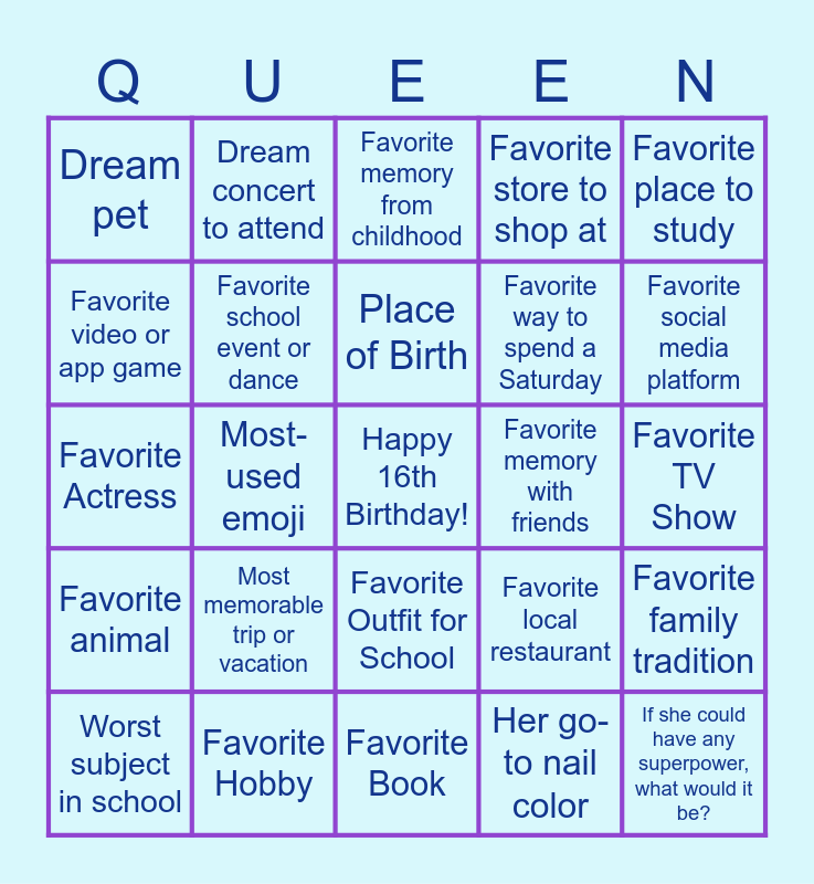 This bingo card has a free space and 90 words: te Starbucks Order, Least Favorite Color, Favorite Outfit for School, Nickname, Favorite Song, Favorite Movie, Favorite Musical Artist, Plays This Instrument, Favorite Subject In School, Dream College, Favorite Ice Cream Flavor, Favorite food, Food She Won't Eat, Favorite TV Show, Favorite Show as a Child, Place of Birth, Year of Birth, Birth Weight, Favorite Disney Movie, Favorite Holiday, Favorite Season, Favorite Holiday Activity, Favorite Book, Favorite Actor, Favorite Actress, Favorite Hobby, Dream vacation destination, Celebrity crush, Favorite sport to play, Favorite sport to watch, Dream job/career, Favorite family tradition, Biggest pet peeve, Favorite animal, Dream pet, Favorite store to shop at, Favorite memory from childhood, Favorite type of weather, Most-used emoji, Favorite social media platform, Worst subject in school, Favorite video or app game, First concert attended, Favorite app on her phone, Morning person or night owl?, Favorite local restaurant, Biggest fear, Favorite dessert (besides ice cream), Dream car, Favorite board/card game, Best gift she's ever received, Favorite way to spend a Saturday, Favorite scent/perfume, Favorite hairstyle, Ideal birthday celebration, Favorite makeup brand (if she wears it), Favorite memory with friends, What makes her laugh the most, Favorite type of music, Favorite accessory to wear, Who's her role model, Most-used phrase or saying, Favorite childhood toy, Coffee or tea person?, Sweet or savory snack preference, Favorite memory from middle school, Favorite family memory, Her go-to nail color, Favorite YouTube channel, Favorite thing about her birthday month, Most memorable trip or vacation, If she could have any superpower, what would it be?, Favorite gemstone or jewelry, Something she collects, Dream concert to attend, Favorite school event or dance, Most-used app on her phone, Favorite pizza topping, Favorite childhood game, Texting or calling preference, Favorite time of day, Favorite place to study, Her most-watched movie, Most embarrassing moment she'll admit to, Her lucky number, What she's most proud of, Favorite sandwich, Where she sees herself in 10 years, Favorite thing about being a teenager and Most exciting thing about turning 16.