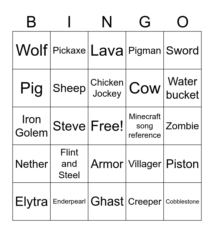 This bingo card has a free space and 24 words: Flint and Steel, Enderpearl, Chicken Jockey, Elytra, Sword, Wolf, Pig, Pickaxe, Minecraft song reference, Armor, Cow, Iron Golem, Villager, Piston, Sheep, Creeper, Zombie, Lava, Water bucket, Steve, Cobblestone, Nether, Pigman and Ghast.