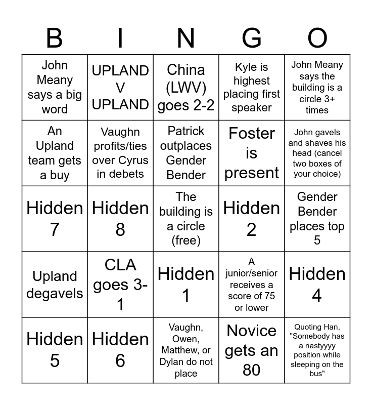 This bingo card has a free space and 29 words: Hidden 5, Hidden 3, Hidden 8, Cyrus profits/ties over Vaughn in debets, John Meany says a big word, China (LWV) goes 2-2, Vaughn profits/ties over Cyrus in debets, CLA goes 3-1, Hidden 2, Hidden 6, Gender Bender places top 5, Quoting Han, "Somebody has a nastyyyy position while sleeping on the bus", Vaughn, Owen, Matthew, or Dylan do not place, Novice gets an 80, John gavels and shaves his head (cancel two boxes of your choice), Genetic cloning or smthn similar is impromptu, Hidden 1, Upland degavels, John Meany says the building is a circle 3+ times, Hidden 7, A junior/senior receives a score of 75 or lower, Cyrus and/or Elyas places, Foster is present, An Upland team gets a buy, Kyle is highest placing first speaker, UPLAND V UPLAND, Hidden 4, Patrick outplaces Gender Bender and JMR goes 4-0.