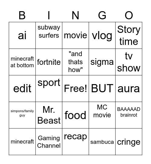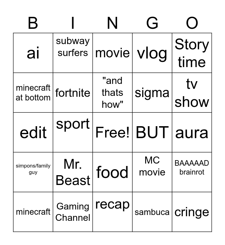 This bingo card has a free space and 24 words: Mr. Beast, Gaming Channel, "and thats how", minecraft, Story time, ai, minecraft at bottom, subway surfers, BUT, food, sigma, edit, MC movie, BAAAAAD brainrot, fortnite, sambuca, aura, movie, tv show, sport, cringe, simpons/family guy, vlog and recap.