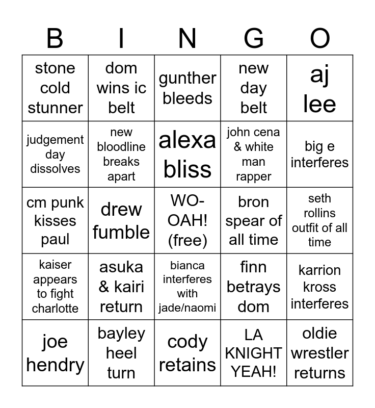 This bingo card has a free space and 24 words: asuka & kairi return, bayley heel turn, alexa bliss, joe hendry, aj lee, stone cold stunner, judgement day dissolves, dom wins ic belt, bron spear of all time, bianca interferes with jade/naomi, john cena & white man rapper, cm punk kisses paul, finn betrays dom, karrion kross interferes, new bloodline breaks apart, LA KNIGHT YEAH!, seth rollins outfit of all time, gunther bleeds, big e interferes, drew fumble, oldie wrestler returns, kaiser appears to fight charlotte, new day belt and cody retains.