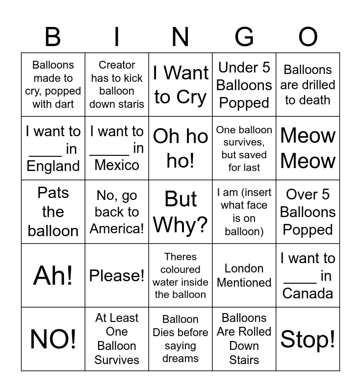 This bingo card has a free space and 25 words: Ah!, At Least One Balloon Survives, Balloon Dies before saying dreams, Balloons Are Rolled Down Stairs, Balloons are drilled to death, Balloons made to cry, popped with dart, Creator has to kick balloon down staris, I Want to Cry, I am (insert what face is on balloon), I want to ____ in Canada, I want to ____ in England, I want to _____ in Mexico, I want to _____ in Russia, London Mentioned, Meow Meow, NO!, No, go back to America!, Oh ho ho!, One balloon survives, but saved for last, Over 5 Balloons Popped, Pats the balloon, Please!, Theres coloured water inside the balloon, Under 5 Balloons Popped and Stop!.