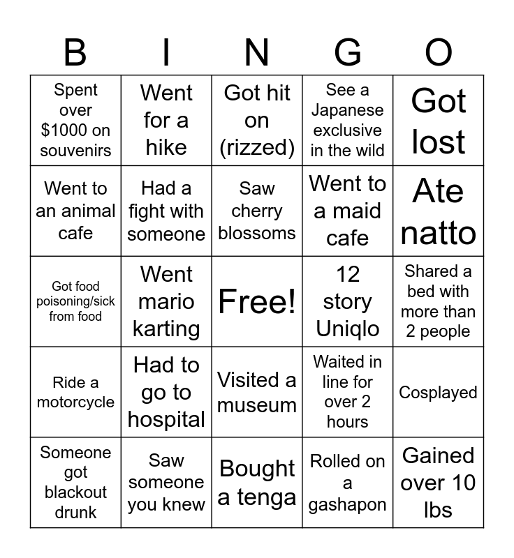 This bingo card has a free space and 34 words: Won a plushie through a claw machine, Rolled on a gashapon, Got scammed, Talk to a stranger, Ride a motorcycle, Had a fight with someone, Got lost, Someone got blackout drunk, Went for a hike, Took a ferry, Saw cherry blossoms, Got hit on (rizzed), Saw someone famous, Don Quijote, 12 story Uniqlo, Ate natto, Saw someone you knew, Got food poisoning/sick from food, Had to go to hospital, Waited in line for over 2 hours, Visited a museum, Went to an onsen, Spent over $1000 on souvenirs, Shared a bed with more than 2 people, Bought a tenga, Gained over 10 lbs, See a Japanese exclusive in the wild, Spilled food, Went to a maid cafe, Went to an animal cafe, Tried an exotic meat like horse, Went mario karting, Cosplayed and Got kicked out.