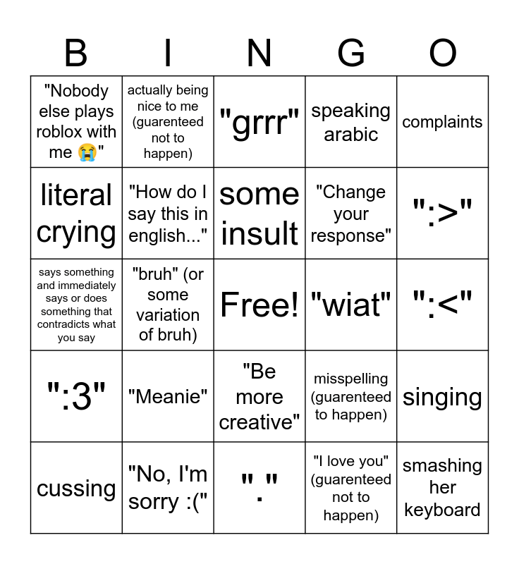 This bingo card has a free space and 24 words: "Meanie", "No, I'm sorry :(", some insult, cussing, complaints, "Nobody else plays roblox with me ðŸ˜", literal crying, actually being nice to me (guarenteed not to happen), "wiat", "Be more creative", "Change your response", says something and immediately says or does something that contradicts what you say, misspelling (guarenteed to happen), singing, "How do I say this in english...", "I love you" (guarenteed not to happen), ":<", "grrr", ":>", "bruh" (or some variation of bruh), smashing her keyboard, ":3", speaking arabic and ".".