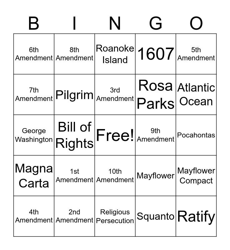 This bingo card has a free space and 24 words: 1st Amendment, 2nd Amendment, 3rd Amendment, 4th Amendment, 5th Amendment, 6th Amendment, 7th Amendment, 8th Amendment, 9th Amendment, 10th Amendment, Rosa Parks, George Washington, Mayflower, Mayflower Compact, Pilgrim, Squanto, Pocahontas, Roanoke Island, Atlantic Ocean, Bill of Rights, Ratify, Magna Carta, 1607 and Religious Persecution.