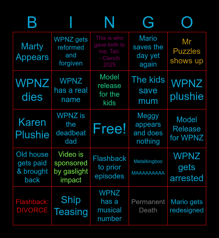 This bingo card has a free space and 24 words: Flashback: DIVORCE, Video is sponsored by gaslight impact, Model release for the kids, Permanent Death, Mr Puzzles shows up, Marty Appears, WPNZ gets reformed and forgiven, This is who gave birth to me, Tari. - Clench 2025, Meggy appears and does nothing, Model Release for WPNZ, Karen Plushie, WPNZ has a real name, Metalkingboo MAAAAAAAAA, WPNZ gets arrested, WPNZ dies, Ship Teasing, WPNZ has a musical number, Mario saves the day yet again, WPNZ plushie, Old house gets paid & brought back, WPNZ is the deadbeat dad, Flashback to prior episodes, The kids save mum and Mario gets redesigned.