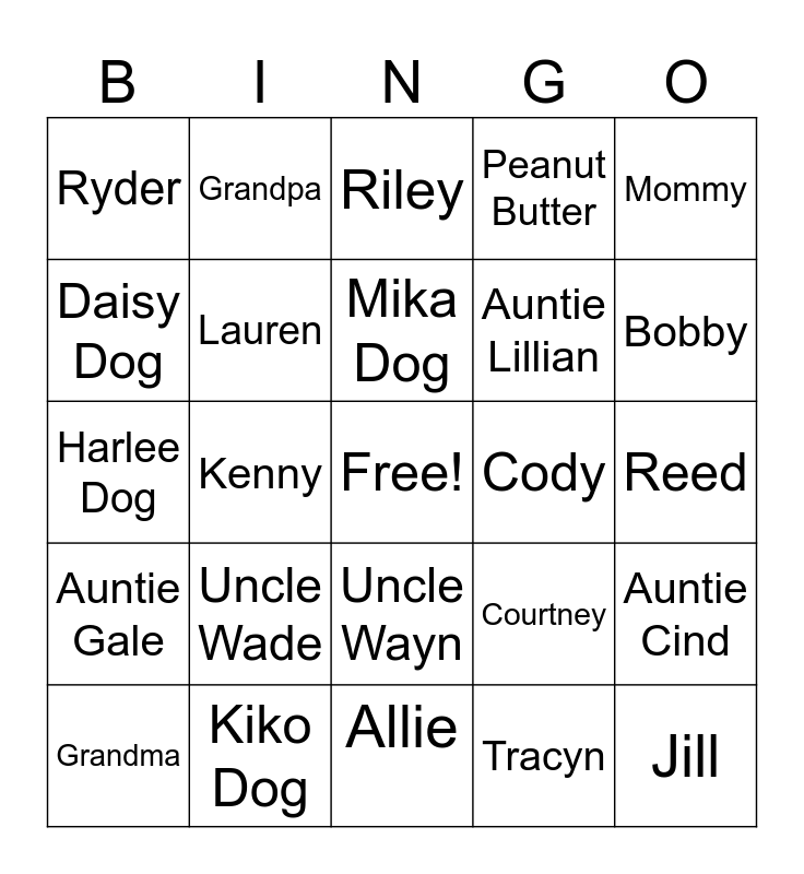 This bingo card has a free space and 31 words: Allie, Cate, Kenny, Kylana, Ryder, Riley, Lauren, Courtney, Cody, Tracyn, Reed, Jill, Josten, Chelsea, Bobby, Jamie, Auntie Cind, Uncle Wade, Auntie Gale, Uncle Wayn, Mommy, Daddy, Grandma, Grandpa, Auntie Lillian, Daisy Dog, Peanut Butter, Harlee Dog, Kiko Dog, Mika Dog and Bugsey Dog.