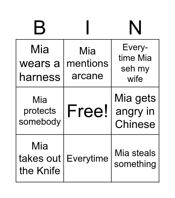 This bingo card has a free space and 10 words: Everytime, Every-time Mia seh my wife, Mia wears a harness, Mia steals something, Mia protects somebody, Mia takes out the Knife, Mia mentions arcane, Mia speaks Chinese, Mia gets angry in Chinese and Mia makes a medical reference.