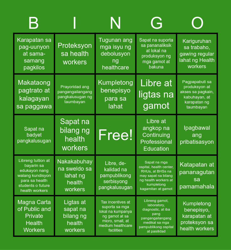 This bingo card has a free space and 24 words: Nakakabuhay na sweldo sa lahat ng health workers, Ligtas at sapat na bilang ng health workers, Kumpletong benepisyo para sa lahat, Magna Carta of Public and Private Health Workers, Kariguruhan sa trabaho, gawing regular lahat ng Health workers, Karapatan sa pag-uunyon at sama-samang pagkilos, Makataong pagtrato at kalagayan sa paggawa, Proteksyon sa health workers, Libre at angkop na Continuing Professional Education, Libre, de-kalidad na pampublikong serbisyong pangkalusugan, Libre at ligtas na gamot, Sapat na badyet pangkalusugan, Sapat na mga ospital, health center, RHUs, at BHSs na may sapat na bilang ng health workers at kumpletong kagamitan at gamot, Katapatan at pananagutan sa pamamahala, Prayoridad ang pangangailangang pangkalusugan ng taumbayan, Libreng gamot, laboratory, diagnostic, at iba pang pangangailangang medikal sa mga pampublikong ospital at pasilidad, Ipagbawal ang pribatisasyon, Tugunan ang mga isyu ng debolusyon ng healthcare, Pagpapabuti sa produksyon at akses sa pagkain, kabuhayan, at karapatan ng taumbayan, Sapat na bilang ng health workers, Kumpletong benepisyo, karapatan at proteksyon sa health workers, Libreng tuition at bayarin sa edukayon nang walang kundisyon para sa health students o future health workers, Sapat na suporta sa pananaliksik at lokal na produksyon ng mga gamot at bakuna and Tax incentives at suporta sa mga lokal na kumpanya ng gamot at sa micro, small, at medium healthcare facilities.