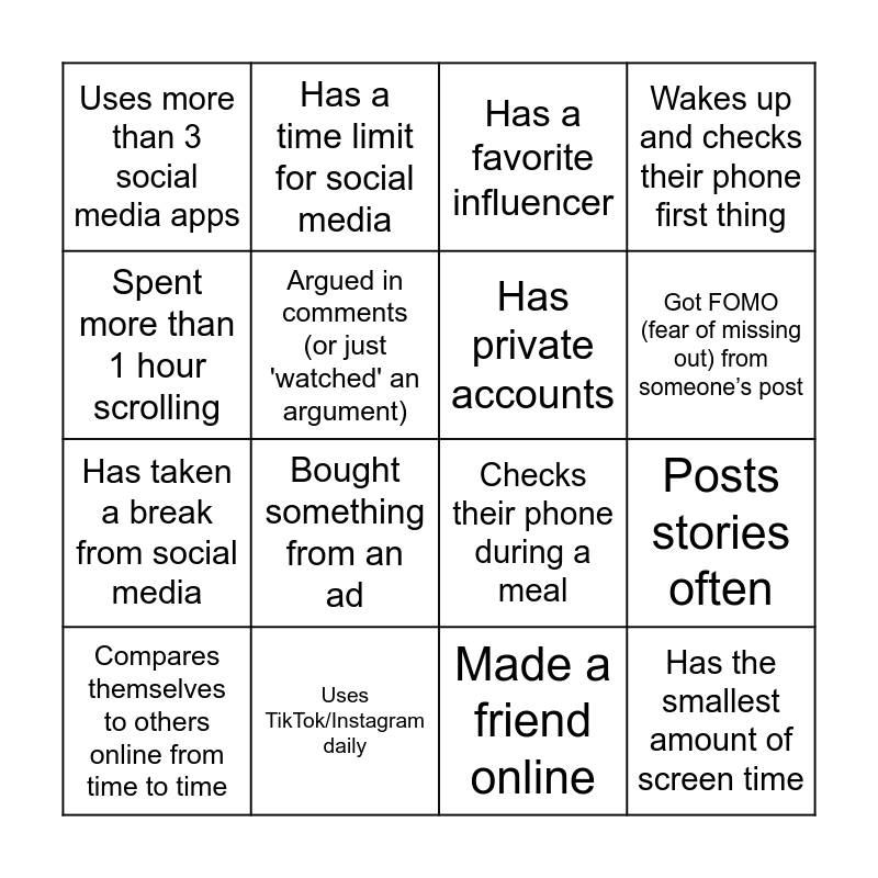 This bingo card has 16 words: Uses TikTok/Instagram daily, Posts stories often, Has a favorite influencer, Uses more than 3 social media apps, Has taken a break from social media, Has a time limit for social media, Checks their phone during a meal, Made a friend online, Spent more than 1 hour scrolling, Argued in comments (or just 'watched' an argument), Compares themselves to others online from time to time, Wakes up and checks their phone first thing, Bought something from an ad, Got FOMO (fear of missing out) from someone’s post, Has private accounts and Has the smallest amount of screen time.