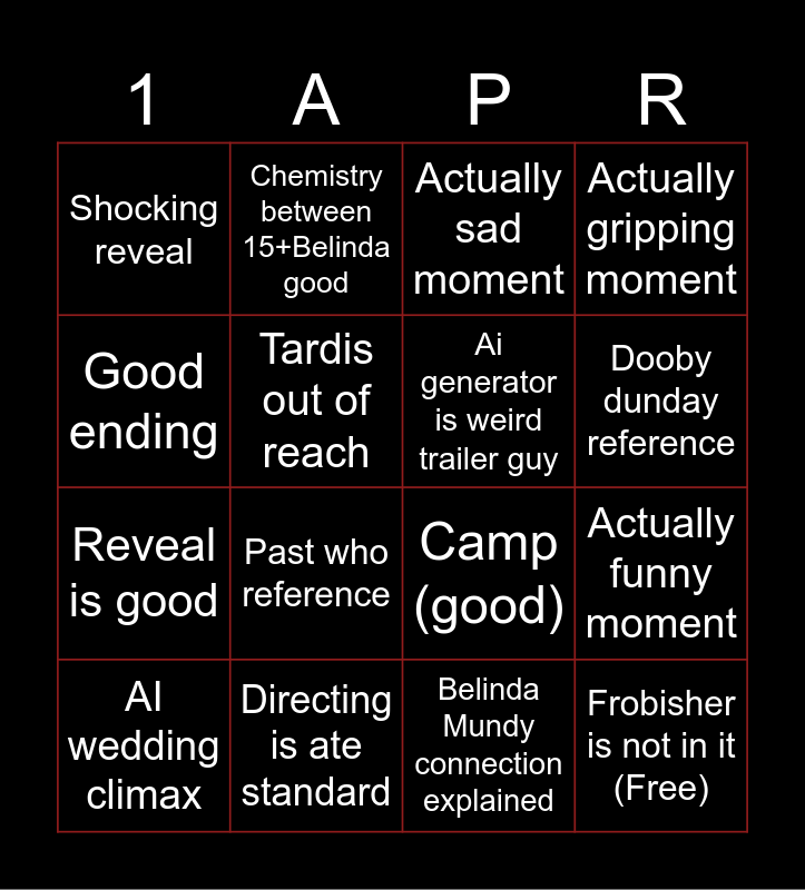 This bingo card has 16 words: Directing is ate standard, Actually funny moment, Actually sad moment, Shocking reveal, Reveal is good, Chemistry between 15+Belinda good, Camp (good), Belinda Mundy connection explained, Good ending, Tardis out of reach, AI wedding climax, Actually gripping moment, Past who reference, Dooby dunday reference, Ai generator is weird trailer guy and Frobisher is not in it (Free).