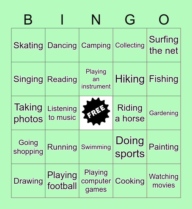 This bingo card has a free space and 24 words: Running, Playing football, Playing an instrument, Drawing, Surfing the net, Skating, Singing, Dancing, Riding a horse, Swimming, Hiking, Taking photos, Doing sports, Painting, Reading, Cooking, Gardening, Camping, Fishing, Listening to music, Watching movies, Going shopping, Collecting and Playing computer games.