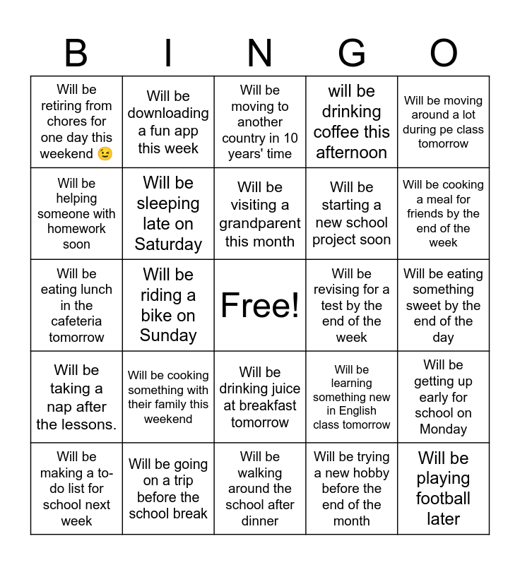 This bingo card has a free space and 24 words: Will be cooking something with their family this weekend, Will be going on a trip before the school break, Will be visiting a grandparent this month, Will be making a to-do list for school next week, Will be moving around a lot during pe class tomorrow, Will be retiring from chores for one day this weekend 😉, Will be helping someone with homework soon, Will be downloading a fun app this week, Will be revising for a test by the end of the week, Will be drinking juice at breakfast tomorrow, Will be starting a new school project soon, Will be eating lunch in the cafeteria tomorrow, Will be learning something new in English class tomorrow, Will be getting up early for school on Monday, Will be sleeping late on Saturday, Will be trying a new hobby before the end of the month, Will be eating something sweet by the end of the day, Will be moving to another country in 10 years' time, Will be cooking a meal for friends by the end of the week, Will be riding a bike on Sunday, Will be playing football later, Will be taking a nap after the lessons., will be drinking coffee this afternoon and Will be walking around the school after dinner.
