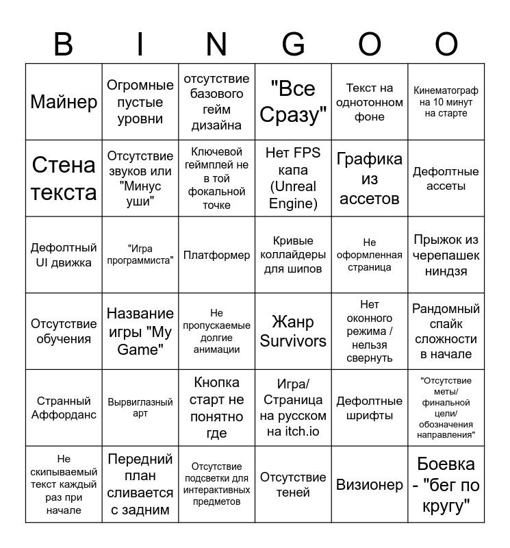 This bingo card has 36 words: Игра/Страница на русском на itch.io, Кнопка старт не понятно где, Отсутствие теней, Стена текста, Отсутствие обучения, Кривые коллайдеры для шипов, Отсутствие звуков или "Минус уши", Отсутствие подсветки для интерактивных предметов, Текст на однотонном фоне, Дефолтные шрифты, Дефолтные ассеты, "Все Сразу", "Отсутствие меты/финальной цели/обозначения направления", "Игра программиста", Нет FPS капа (Unreal Engine), Майнер, Странный Аффорданс, Не оформленная страница, Дефолтный UI движка, отсутствие базового гейм дизайна, Платформер, Название игры "My Game", Жанр Survivors, Не пропускаемые долгие анимации, Нет оконного режима / нельзя свернуть, Огромные пустые уровни, Графика из ассетов, Передний план сливается с задним, Ключевой геймплей не в той фокальной точке, Кинематограф на 10 минут на старте, Боевка - "бег по кругу", Не скипываемый текст каждый раз при начале, Рандомный спайк сложности в начале, Прыжок из черепашек ниндзя, Вырвиглазный арт and Визионер.