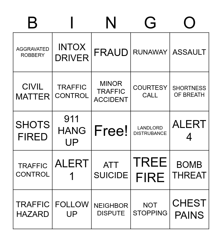 This bingo card has a free space and 74 words: BOLO, BLDG FIRE, FRAUD, CHEST PAINS, NOISE COMPLAINT, PHYSC CALL, CHILD CUSTODY, SUSPICIOUS PERSON, TRAFFIC HAZARD, WELFARE CHECK, LAW ALARM, LIVESTOCK ON ROADWAY, MINOR TRAFFIC ACCIDENT, CIVIL MATTER, TRESPASSING, 911 HANG UP, DOMESTIC DISPUTE, SHORTNESS OF BREATH, STOLEN VEHICLE, SHOTS FIRED, TRAFFIC CONTROL, INTOX DRIVER, RUNAWAY, I WANT TO TALK TO A SGT, CHEST PAINS, FIRE ALARM, HARASSMENT, NOT AN EMERGENCY BUT......, WARRANT ARREST, ALL AROUND CHECK, ASSAULT, CSI CALL OUT, DRONE CALL OUT, JP REQUEST, TRAFFIC STOP, NOT STOPPING, YOU'RE JUST A DISPATCHER, THEFT, NAMBE SIR, LOOSE ANIMAL, NEIGHBOR DISPUTE, FOLLOW UP, GRASS FIRE, I HAVE A COMPLAINT, MAJOR ACCIDETN, AGGRAVATED ROBBERY, ROBBERY, ALERT 1, ALERT 2, SCHOOL ZONE, ALERT 3, ALERT 0, ALERT 4, BURG OF VEH, BURG OF BLDG, BURG OF HAB, ATT SUICIDE, BAD CHECK, CFB, BOMB THREAT, COURTESY CALL, CREDIT CARD ABUSE, TRAFFIC CONTROL, DEAD BODY, LANDLORD DISTRUBANCE, FIGHT, TRASH FIRE, VEH FIRE, TREE FIRE, OFF DUTY SECURITY, PROPERTY DAMAGE, SECURITY, STABBING and SUBJ SHOT.