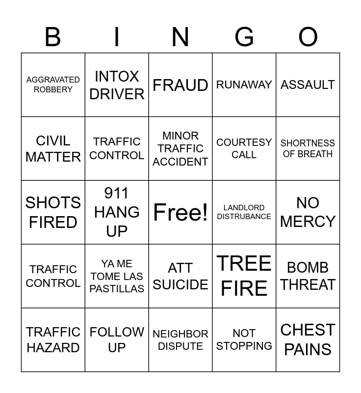 This bingo card has a free space and 74 words: BOLO, BLDG FIRE, FRAUD, CHEST PAINS, NOISE COMPLAINT, PHYSC CALL, CHILD CUSTODY, SUSPICIOUS PERSON, TRAFFIC HAZARD, WELFARE CHECK, LAW ALARM, LIVESTOCK ON ROADWAY, MINOR TRAFFIC ACCIDENT, CIVIL MATTER, TRESPASSING, 911 HANG UP, DOMESTIC DISPUTE, SHORTNESS OF BREATH, STOLEN VEHICLE, SHOTS FIRED, TRAFFIC CONTROL, INTOX DRIVER, RUNAWAY, I WANT TO TALK TO A SGT, CHEST PAINS, FIRE ALARM, HARASSMENT, NOT AN EMERGENCY BUT......, WARRANT ARREST, ALL AROUND CHECK, ASSAULT, CSI CALL OUT, DRONE CALL OUT, JP REQUEST, TRAFFIC STOP, NOT STOPPING, YOU'RE JUST A DISPATCHER, THEFT, NAMBE SIR, LOOSE ANIMAL, NEIGHBOR DISPUTE, FOLLOW UP, GRASS FIRE, I HAVE A COMPLAINT, MAJOR ACCIDETN, AGGRAVATED ROBBERY, ROBBERY, YA ME TOME LAS PASTILLAS, YA ME VOY IR A DORMIR, SCHOOL ZONE, JUSTIN TIMBERLAKE IS IN MY HOUSE, QUE DIA ES HOY, NO MERCY, BURG OF VEH, BURG OF BLDG, BURG OF HAB, ATT SUICIDE, BAD CHECK, CFB, BOMB THREAT, COURTESY CALL, CREDIT CARD ABUSE, TRAFFIC CONTROL, DEAD BODY, LANDLORD DISTRUBANCE, FIGHT, TRASH FIRE, VEH FIRE, TREE FIRE, OFF DUTY SECURITY, PROPERTY DAMAGE, SECURITY, STABBING and SUBJ SHOT.