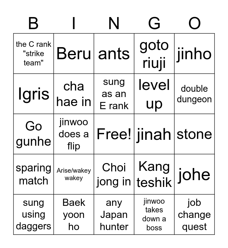 This bingo card has a free space and 24 words: Arise/wakey wakey, Baek yoon ho, sung as an E rank, sung using daggers, jinho, the C rank "strike team", Igris, Beru, jinah, Choi jong in, level up, Go gunhe, Kang teshik, johe, cha hae in, jinwoo takes down a boss, stone, ants, double dungeon, jinwoo does a flip, job change quest, sparing match, goto riuji and any Japan hunter.