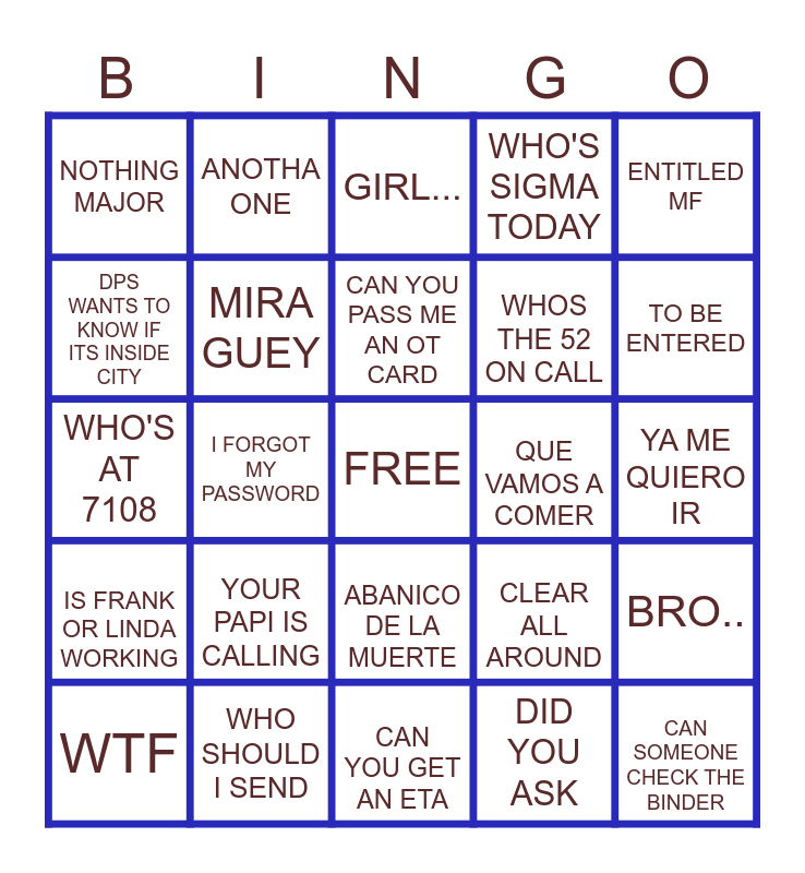 This bingo card has a free space and 29 words: WTF, WHY IS THIS GUY PULLING 38'S, I FORGOT MY PASSWORD, CAN I GET A RELIEF, NOTHING MAJOR, GIRL..., MIRA GUEY, YOUR PAPI IS CALLING, QUE VAMOS A COMER, WHO SHOULD I SEND, YA ME QUIERO IR, CAN SOMEONE CHECK THE BINDER, CAN YOU GET AN ETA, DID YOU ASK, TO BE ENTERED, DON'T GET MY ORDER WRONG, ABANICO DE LA MUERTE, IS FRANK OR LINDA WORKING, ENTITLED MF, WHO'S AT 7108, CLEAR ALL AROUND, IM NOT GOING DOWN FOR THAT, WHOS THE 52 ON CALL, DPS WANTS TO KNOW IF ITS INSIDE CITY, WHO'S SIGMA TODAY, ANOTHA ONE, BRO.., CAN YOU PASS ME AN OT CARD and I WANT TO GO HOME.