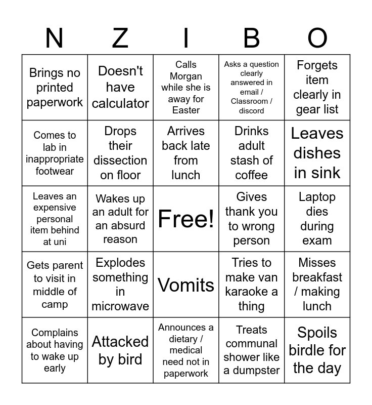 This bingo card has a free space and 24 words: Explodes something in microwave, Attacked by bird, Arrives back late from lunch, Complains about having to wake up early, Forgets item clearly in gear list, Brings no printed paperwork, Comes to lab in inappropriate footwear, Doesn't have calculator, Gives thank you to wrong person, Vomits, Drinks adult stash of coffee, Leaves an expensive personal item behind at uni, Tries to make van karaoke a thing, Misses breakfast / making lunch, Drops their dissection on floor, Treats communal shower like a dumpster, Laptop dies during exam, Calls Morgan while she is away for Easter, Leaves dishes in sink, Wakes up an adult for an absurd reason, Spoils birdle for the day, Gets parent to visit in middle of camp, Asks a question clearly answered in email / Classroom / discord and Announces a dietary / medical need not in paperwork.