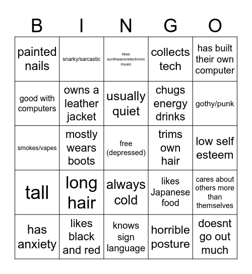 This bingo card has a free space and 24 words: long hair, likes black and red, usually quiet, has anxiety, has built their own computer, painted nails, good with computers, snarky/sarcastic, trims own hair, always cold, chugs energy drinks, smokes/vapes, likes Japanese food, cares about others more than themselves, owns a leather jacket, horrible posture, low self esteem, likes synthwave/electronic music, gothy/punk, mostly wears boots, doesnt go out much, tall, collects tech and knows sign language.