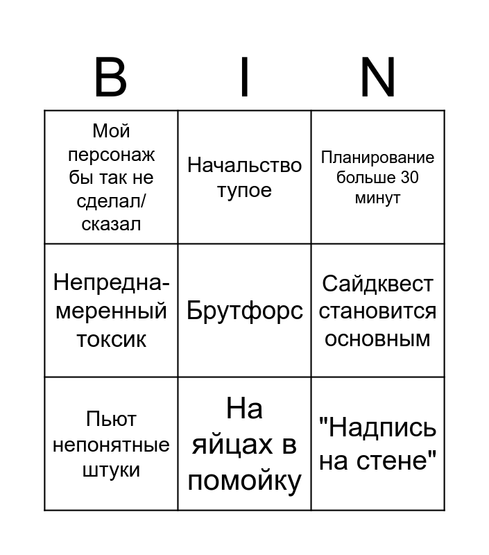 This bingo card has 9 words: Пьют непонятные штуки, Планирование больше 30 минут, Начальство тупое, Непредна-меренный токсик, Мой персонаж бы так не сделал/сказал, Сайдквест становится основным, Брутфорс, "Надпись на стене" and На яйцах в помойку.