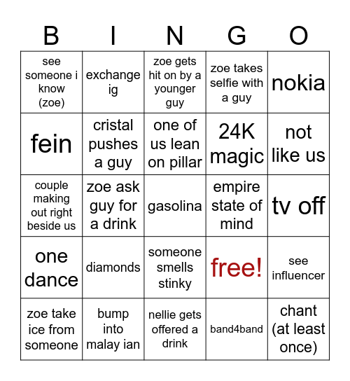 This bingo card has 25 words: diamonds, nellie gets offered a drink, one of us lean on pillar, zoe take ice from someone, nokia, see someone i know (zoe), fein, exchange ig, empire state of mind, someone smells stinky, 24K magic, couple making out right beside us, free!, see influencer, cristal pushes a guy, chant (at least once), tv off, zoe gets hit on by a younger guy, not like us, zoe ask guy for a drink, gasolina, bump into malay ian, one dance, zoe takes selfie with a guy and band4band.