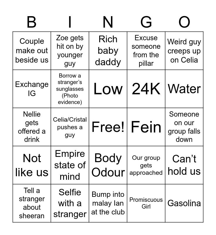 This bingo card has a free space and 24 words: Empire state of mind, Selfie with a stranger, Low, Tell a stranger about sheeran, Weird guy creeps up on Celia, Couple make out beside us, Exchange IG, Zoe gets hit on by younger guy, Fein, Body Odour, 24K, Nellie gets offered a drink, Our group gets approached, Can’t hold us, Borrow a stranger’s sunglasses (Photo evidence), Promiscuous Girl, Someone on our group falls down, Rich baby daddy, Water, Celia/Cristal pushes a guy, Gasolina, Not like us, Excuse someone from the pillar and Bump into malay Ian at the club.