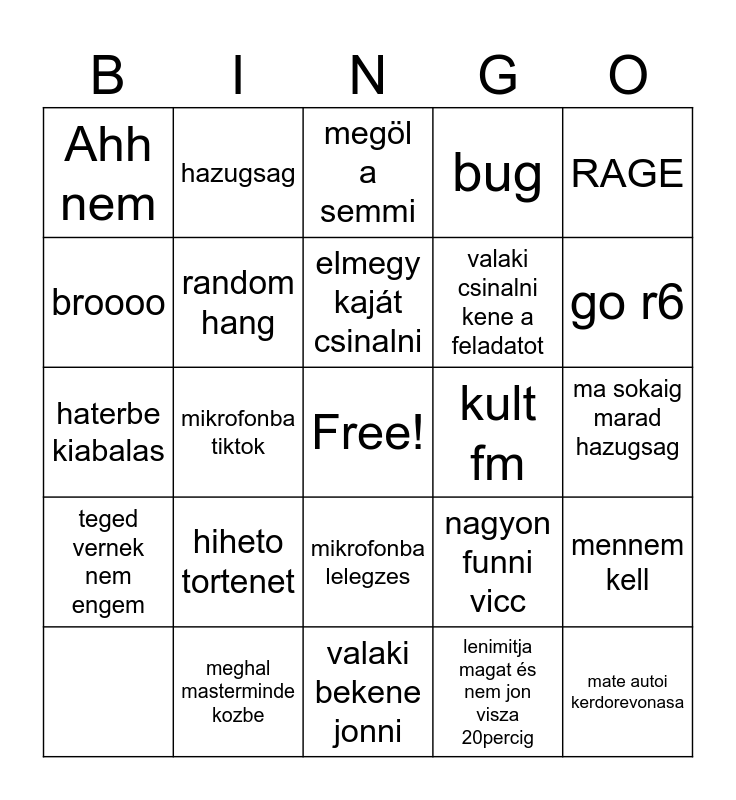 This bingo card has a free space and 24 words: hiheto tortenet, tesom akar jatszani, nagyon funni vicc, mennem kell, Ahh nem, hazugsag, megöl a semmi, bug, go r6, teged vernek nem engem, random hang, elmegy kaját csinalni, lenimitja magat és nem jon visza 20percig, ma sokaig marad hazugsag, broooo, meghal masterminde kozbe, valaki bekene jonni, valaki csinalni kene a feladatot, RAGE, haterbe kiabalas, mikrofonba tiktok, mikrofonba lelegzes, kult fm and mate autoi kerdorevonasa.