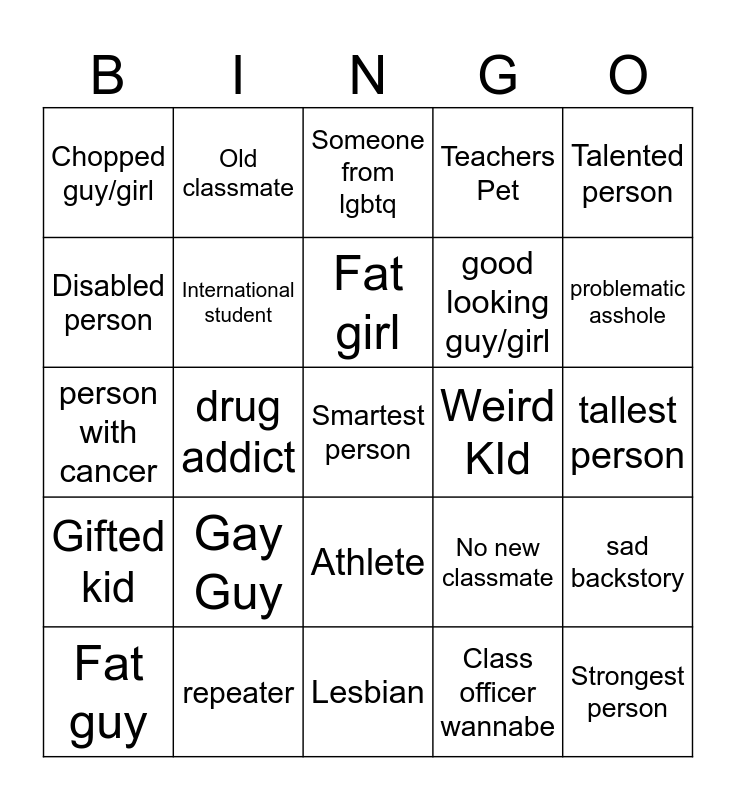 This bingo card has 25 words: Gay Guy, Lesbian, Fat girl, Fat guy, Talented person, Chopped guy/girl, Disabled person, Old classmate, Weird KId, Athlete, good looking guy/girl, person with cancer, No new classmate, sad backstory, International student, Strongest person, tallest person, Someone from lgbtq, problematic asshole, drug addict, Smartest person, repeater, Gifted kid, Teachers Pet and Class officer wannabe.