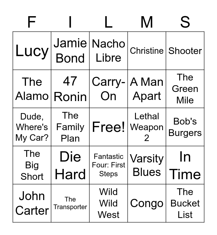 This bingo card has a free space and 64 words: The Big Lebowski, Infinite, Black Hawk Down, In Time, A Working Man, Happy Gilmore 2, Jamie Bond, Elevation, Carry-On, Mortal Kombat 2, Fantastic Four: First Steps, High Rollers, Bob's Burgers, Shooter, Battleship, The Alamo, The Family Plan, Lucy, Gran Torino, A Man Apart, Die Hard, The Big Short, Christine, Alien, Dreamcatcher, Tron, Eagle Eye, Game of Thrones, Antz, Superman, Stranger Things, Burn After Reading, The Ugly Truth, Baby Driver, The Green Mile, John Carter, Rambo: First Blood, Congo, Wanted, 47 Ronin, Dude, Where's My Car?, Lethal Weapon 2, Elektra, Thinner, Snakes on a Plane, The Bucket List, The Transporter, Fear and Loathing in Las Vegas, Varsity Blues, Best in Show, Along Came Polly, Valkyrie, Wild Wild West, Chitty Chitty Bang Bang, Waterworld, Dog Day Afternoon, Nacho Libre, Married to the Mob, Awakenings, Slap Shot, Matilda, Invictus, Sunset Boulevard and Here.