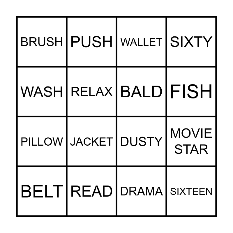 This bingo card has 26 words: WESTERN, FIX, FISH, BLUSH, WASH, BRUSH, RELAX, PUSH, DRAMA, DIRTY, PILLOW, DUSTY, GO TO BED, CLOTHES, MOVIE STAR, HANDS, SIXTY, SIXTEEN, WALLET, BELT, JACKET, HAT, READ, SWEEP, BALD and COMEDY.
