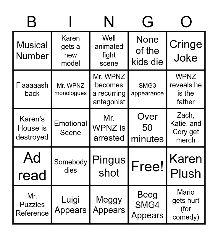 This bingo card has 25 words: Somebody dies, Meggy Appears, Mr. WPNZ becomes a recurring antagonist, Mr. Puzzles Reference, Cringe Joke, Musical Number, Flaaaaash back, Karen gets a new model, Over 50 minutes, Pingus shot, SMG3 appearance, Karen’s House is destroyed, Free!, Karen Plush, Mr. WPNZ monologues, Mario gets hurt (for comedy), Zach, Katie, and Cory get merch, Well animated fight scene, WPNZ reveals he is the father, Emotional Scene, Mr. WPNZ is arrested, Luigi Appears, Ad read, None of the kids die and Beeg SMG4 Appears.