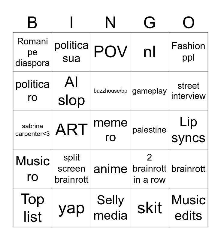This bingo card has 25 words: split screen brainrott, Selly media, buzzhouse/bp, Top list, Fashion ppl, Romani pe diaspora, politica ro, politica sua, palestine, anime, gameplay, sabrina carpenter<3, 2 brainrott in a row, brainrott, AI slop, Music edits, Lip syncs, POV, street interview, ART, meme ro, yap, Music ro, nl and skit.