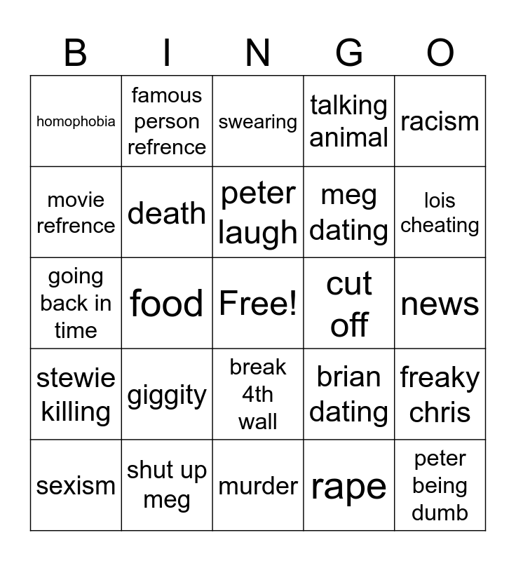 This bingo card has a free space and 24 words: giggity, shut up meg, peter laugh, sexism, racism, homophobia, movie refrence, famous person refrence, cut off, break 4th wall, meg dating, going back in time, brian dating, freaky chris, death, rape, news, swearing, lois cheating, food, peter being dumb, stewie killing, talking animal and murder.