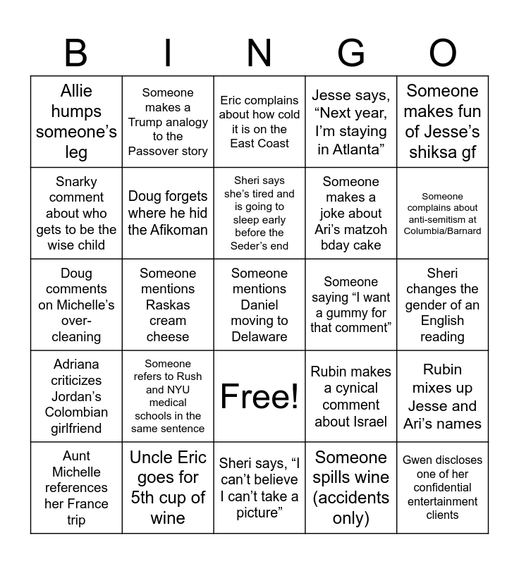 This bingo card has 26 words: Free!, Someone spills wine (accidents only), Sheri says she’s tired and is going to sleep early before the Seder’s end, Uncle Eric goes for 5th cup of wine, Someone makes fun of Jesse’s shiksa gf, Allie humps someone’s leg, Snarky comment about who gets to be the wise child, Someone makes a Trump analogy to the Passover story, Sheri changes the gender of an English reading, Rubin makes a cynical comment about Israel, Someone makes a joke about Ari’s matzoh bday cake, Doug comments on Michelle’s over-cleaning, Rubin mixes up Jesse and Ari’s names, Aunt Michelle references her France trip, Someone mentions Raskas cream cheese, Someone blames 9-year old for Sarah’s NCAA Tournament loss, Jesse says, “Next year, I’m staying in Atlanta”, Adriana criticizes Jordan’s Colombian girlfriend, Eric complains about how cold it is on the East Coast, Someone mentions Daniel moving to Delaware, Someone complains about anti-semitism at Columbia/Barnard, Sheri says, “I can’t believe I can’t take a picture”, Someone saying “I want a gummy for that comment”, Someone refers to Rush and NYU medical schools in the same sentence, Doug forgets where he hid the Afikoman and Gwen discloses one of her confidential entertainment clients.