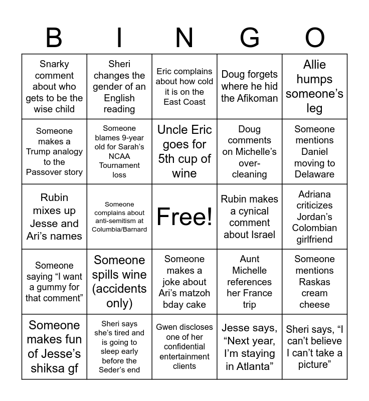 This bingo card has a free space and 24 words: Someone spills wine (accidents only), Sheri says she’s tired and is going to sleep early before the Seder’s end, Uncle Eric goes for 5th cup of wine, Someone makes fun of Jesse’s shiksa gf, Allie humps someone’s leg, Snarky comment about who gets to be the wise child, Someone makes a Trump analogy to the Passover story, Sheri changes the gender of an English reading, Rubin makes a cynical comment about Israel, Someone makes a joke about Ari’s matzoh bday cake, Doug comments on Michelle’s over-cleaning, Rubin mixes up Jesse and Ari’s names, Aunt Michelle references her France trip, Someone mentions Raskas cream cheese, Someone blames 9-year old for Sarah’s NCAA Tournament loss, Jesse says, “Next year, I’m staying in Atlanta”, Adriana criticizes Jordan’s Colombian girlfriend, Eric complains about how cold it is on the East Coast, Someone mentions Daniel moving to Delaware, Someone complains about anti-semitism at Columbia/Barnard, Sheri says, “I can’t believe I can’t take a picture”, Someone saying “I want a gummy for that comment”, Doug forgets where he hid the Afikoman and Gwen discloses one of her confidential entertainment clients.