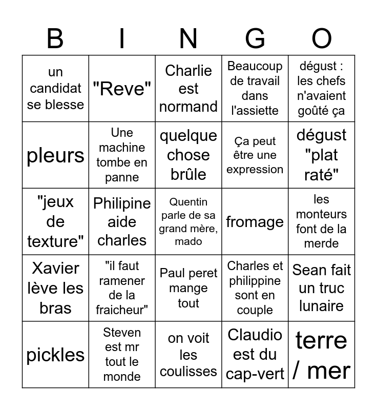 This bingo card has a free space and 79 words: Etchebest frappe un candidat, dégust : coup de coeur, Charlie est normand, "Je pars sur..", jeux de mots pourris, Noé est belge, dégust : manque de sauce, Charlie a la collection des guides michelins, "guide michelin", remarque beauf / sexiste, Darroze chante, dégust : pas assez d'assaisonnement, Beaucoup de travail dans l'assiette, un candidat se blesse, Le Quellec a fait Top Chef, pleurs, dégust : compliment sur le plat, "il faut ramener de la fraicheur", quelque chose tombe, les monteurs font de la merde, dégust : mauvaise cuisson, dégust : les chefs n'avaient goûté ça, "jeux de texture", quelque chose brûle, Une machine tombe en panne, revisité / déstructuré, allusion à la guerre, Margaux met son terroir à l'honneur, Philippine fait un truc qu'elle n'a jamais fait, "on voyage", dégust "plat raté", hors-sujet, on voit les coulisses, Ça pourrait être une assiette dans mon restaurant / étoilé, pickles, fromage, champignon, végétarien, patisserie, terre / mer, crustacés, friture, trompe l'oeil, Bisou, Bamos, "Reve", Qqch de végétale, C'est moche, Claudio a fait les palaces, Sean est hors norme, Sean fait un truc lunaire, Philipine aide charles, Charles et philippine sont en couple, Citron caviar, Pub en thême avec l'épreuve, Pub avec un ancien, Restaurant éphémère, Peut etre gagner une étoile, Installation des inspecteurs Michelin, Paul peret mange tout, Ça peut être une expression, 10 "coup de cœur", Sean donne un titre de livre a son plat, La machine du 93 (Grégoire), Charlie n'a pas été dégusté, Chef perret fait l'avion, Esteban est colombien, Grégoire est insupportable, Noémie est baroudeuse, Xavier lève les bras, Steven est mr tout le monde, c'est qui lui (Steven), Margaux est propriétaire d'une auberge, cuisine généreuse, Quentin gagne l'épreuve, Claudio est du cap-vert, Noé veut trop en faire, Noémie fait voyager avec son plat and stephane rosenberg ne dit pas "on lève les bras".