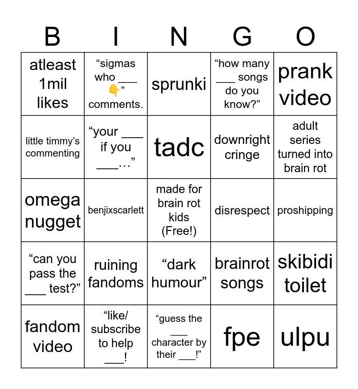 This bingo card has a free space and 24 words: ruining fandoms, “like/ subscribe to help ___!, tadc, fandom video, prank video, atleast 1mil likes, little timmy’s commenting, “sigmas who ___👇” comments., disrespect, “dark humour”, downright cringe, omega nugget, brainrot songs, skibidi toilet, “your ___ if you ___…”, fpe, proshipping, sprunki, adult series turned into brain rot, benjixscarlett, ulpu, “can you pass the ___ test?”, “how many ___ songs do you know?” and “guess the ___ character by their ___!”.