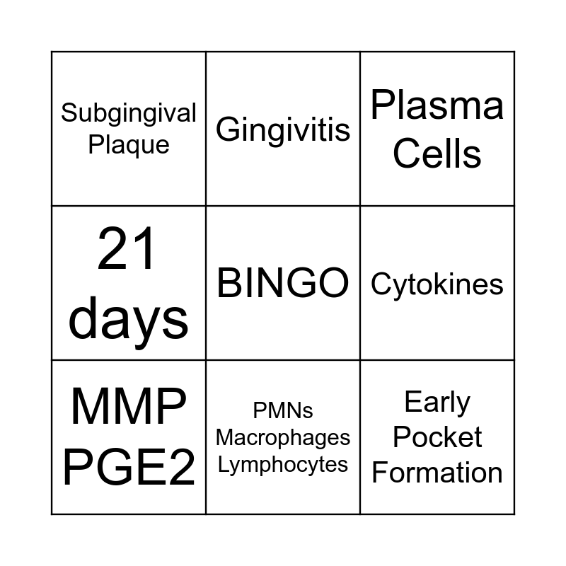 This bingo card has a free space and 8 words: Cytokines, Plasma Cells, Gingivitis, MMP PGE2, Subgingival Plaque, Early Pocket Formation, 21 days and PMNs Macrophages Lymphocytes.