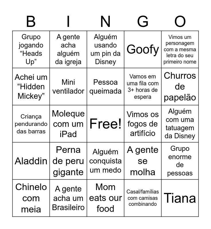 This bingo card has a free space and 24 words: Perna de peru gigante, A gente acha um Brasileiro, Pessoa queimada, Chinelo com meia, Vimos um personagem com a mesma letra do seu primeiro nome, Grupo jogando “Heads Up”, Achei um “Hidden Mickey”, A gente acha alguém da igreja, Vimos os fogos de artifício, Alguém conquista um medo, Vamos em uma fila com 3+ horas de espera, Criança pendurando das barras, A gente se molha, Grupo enorme de pessoas, Mini ventilador, Casal/famílias com camisas combinando, Alguém com uma tatuagem da Disney, Alguém usando um pin da Disney, Churros de papelão, Moleque com um iPad, Tiana, Aladdin, Goofy and Mom eats our food.