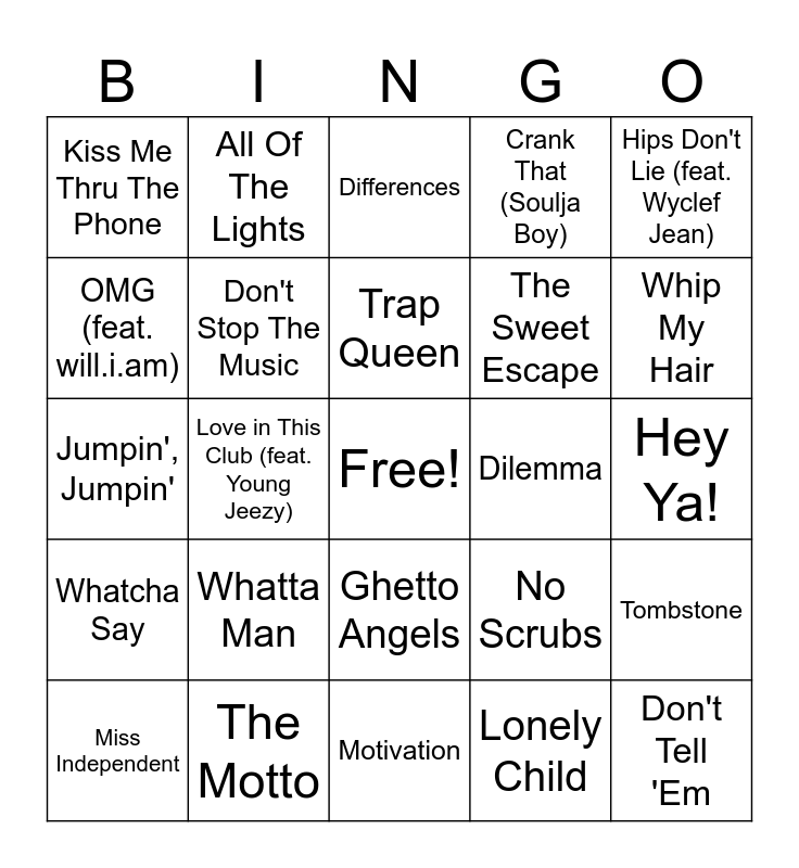 This bingo card has a free space and 82 words: Baby, U Got It Bad, Differences, The Boy Is Mine, Timeless (feat Playboi Carti), BMF, Rock Your Body, I Gotta Feeling, Starships, What's My Name?, Say My Name, Genie In a Bottle, Don't Stop The Music, Dilemma, My Boo, Kiss Me Thru The Phone, Miss Independent, OMG (feat. will.i.am), Yeah! (feat. Lil Jon & Ludacris), SexyBack (feat. Timbaland), Only Girl (In The World), The Sweet Escape, Don't Tell 'Em, Hips Don't Lie (feat. Wyclef Jean), Love in This Club (feat. Young Jeezy), Dynamite, Promiscuous, Empire State Of Mind, She Knows, Fantasy, Whatta Man, Waterfalls, Jumpin', Jumpin', Hit 'Em Up Style (Oops!), Oh (feat. Ludacris), Motivation, Blame It, Bills, Bills, Bills, Whip My Hair, Like a Boy, Buy U a Drank (Shawty Snappin') (feat. Yung Joc), Crank That (Soulja Boy), Black and Yellow, Want to Want Me, Best I Ever Had, All Of The Lights, This Could Be Us, Trap Queen, Swimming Pools (Drank), Drop It Like It's Hot, oui, Hey Ya!, The Motto, Love, Killing Me Softly With His Song, Again, Wet Dreamz, So Fresh, So Clean, Candy Rain, No Scrubs, Hot In Herre, Umbrella, Whatcha Say, Work, Hotline Bling, Black Beatles, Can't Feel My Face, DJ Got Us Fallin' In Love (feat. Pitbull), NOKIA, GOOD CREDIT (with Kendrick Lamar), Pa Japon, DENIAL IS A RIVER, Ghetto Angels, Lonely Child, Make No Sense, Yacht Party, peekaboo (feat. azchike), luther (with sza), When I See U, 25, Tombstone and WHATCHU KNO ABOUT ME (with Sexyy Red).