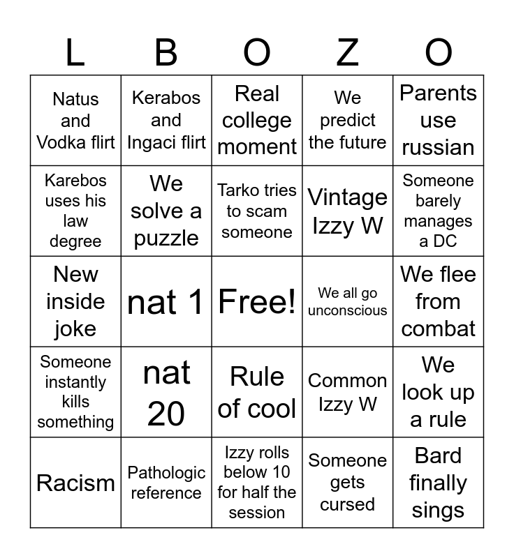 This bingo card has a free space and 29 words: Racism, We make Natus sigh, nat 1, Parents argue, Natus and Vodka flirt, Real college moment, We solve a puzzle, nat 20, We all go unconscious, Pathologic reference, We flee from combat, Bard finally sings, Izzy rolls below 10 for half the session, Someone gets cursed, Someone barely manages a DC, Someone gets sick, Rule of cool, Someone instantly kills something, Parents use russian, New inside joke, Common Izzy W, Blind Eri moment, Vintage Izzy W, Karebos uses his law degree, We predict the future, Kerabos and Ingaci flirt, We look up a rule, Tarko tries to scam someone and "Muh Immersion GM".
