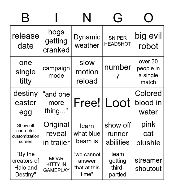 This bingo card has a free space and 24 words: Original reveal in trailer, MOAR KITTY IN GAMEPLAY, slow motion reload, "By the creators of Halo and Destiny", big evil robot, release date, one single titty, hogs getting cranked, Loot, learn what blue beam is, number 7, destiny easter egg, show off runner abilities, pink cat plushie, campaign mode, team getting third-partied, Colored blood in water, Dynamic weather, over 30 people in a single match, "and one more thing...", streamer shoutout, Show off character customization screen, SNIPER HEADSHOT and "we cannot answer that at this time".