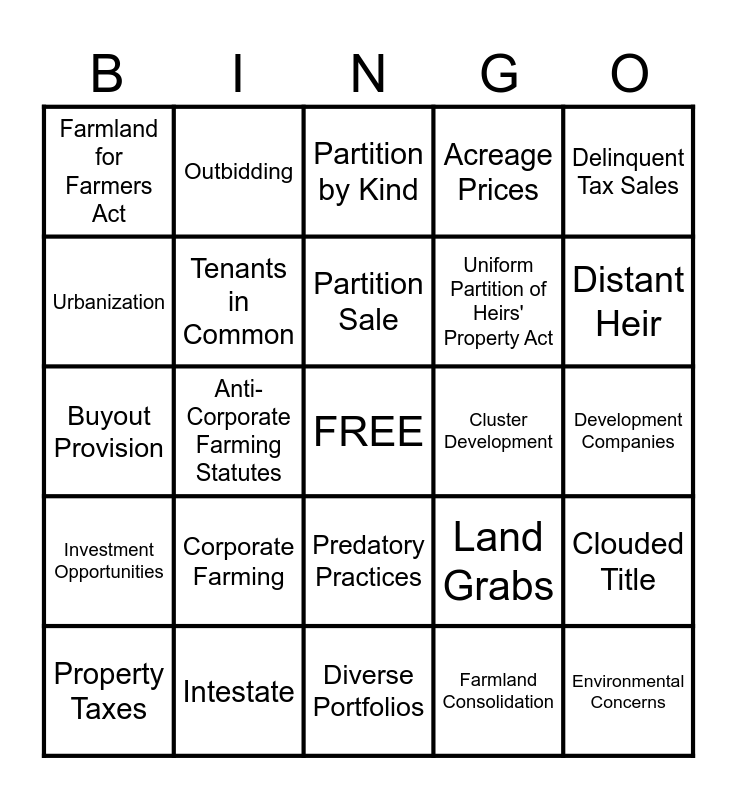 This bingo card has a free space and 24 words: Corporate Farming, Intestate, Partition Sale, Property Taxes, Delinquent Tax Sales, Farmland for Farmers Act, Urbanization, Outbidding, Cluster Development, Predatory Practices, Uniform Partition of Heirs' Property Act, Buyout Provision, Land Grabs, Clouded Title, Tenants in Common, Farmland Consolidation, Development Companies, Partition by Kind, Distant Heir, Anti-Corporate Farming Statutes, Environmental Concerns, Investment Opportunities, Acreage Prices and Diverse Portfolios.