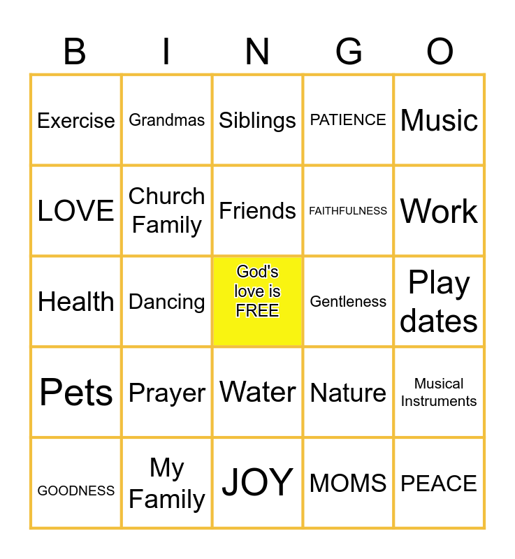 This bingo card has a free space and 34 words: JESUS, MOMS, Shelter Housing, The Bible God's Word, Pets, Church Family, Music, GOODNESS, Grandmas, Food, Friends, Siblings, Freedom, The Holy Spirit, Gentleness, Work, My Family, Health, Prayer, Nature, Water, Clothing, Exercise, Play dates, JOY, PEACE, PATIENCE, KINDNESS, FAITHFULNESS, LOVE, Sports, Dancing, Musical Instruments and Toys.