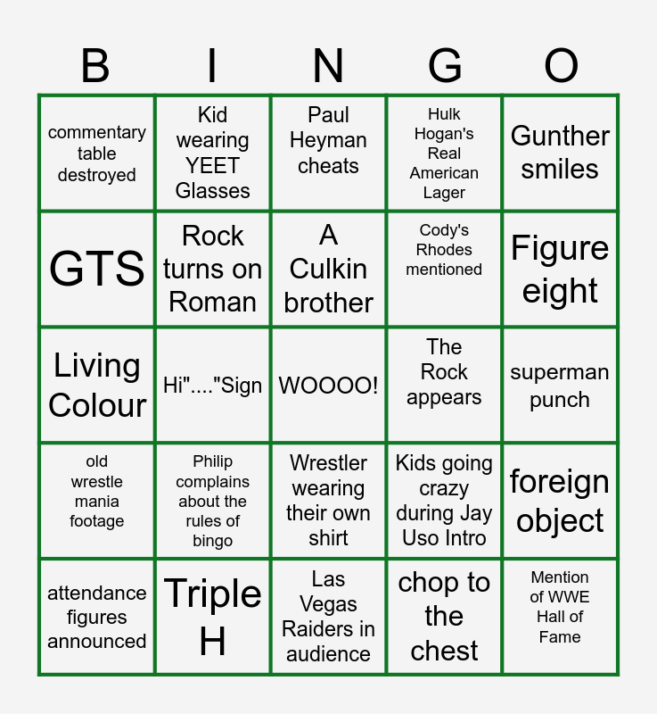 This bingo card has a free space and 79 words: Carrot Top, Jey Uso wins title, Paul Heyman cheats, Jey Uso wins by disqualification, Brock Lesnar Shows Up, Gunther retains, LA Knight Chant, View of Las Vegas Strip, An Uso helps Roman Reigns, New Day Rocks Chant, Rey Mysterio wins, Unexpected heel turn, Hulk Hogan's Real American Lager, Gunther smiles, NAOMI Cheats, Rock turns on Roman, SPEAR!, The Rock appears, John Cena appears, Living Colour, Prime drink commercial or product placement, A Culkin brother, Cody's Rhodes mentioned, Figure eight, commentary table destroyed, Pat MacAfee stands on chair, "Head of The Table", The Rock Mentioned, John Cena "farewell tour" mentioned, rope break, Philip complains about the rules of bingo, 619, chop to the chest, superman punch, someone bleeds, Triple H, pyrotechnics, CM Punk sign, foreign object, GTS, Dom Mysterio, Kaiser helps Gunther, "yes my tribal chief", YEET, Free space, Kid wearing YEET Glasses, Wrestler wearing their own shirt, "My Name is Paul Heyman", Commercial for WWE shop, Chad Gable Mentioned, "This Is Awesome" chant, Las Vegas Raiders in audience, Kids going crazy during Jay Uso Intro, Seth Rollins sunglasses, Pepsi Tattoo, win by submission, ref knocked out, Luchador run-in, wrestlers mask pulled off, attendance figures announced, Hi"...."Sign, move reversal, Solo Sikoa, Seth Rollins intro, over top rope, hair pull, free space, kid gets hi-five, Las Vegas Nevada, old wrestle mania footage, kick out of finishing move, mention of The Shield, "It's clobberin' time", Mention of WWE Hall of Fame, Free Space, Champ retains title, wrestler uses opponent's finishing move, live band and surprise return.