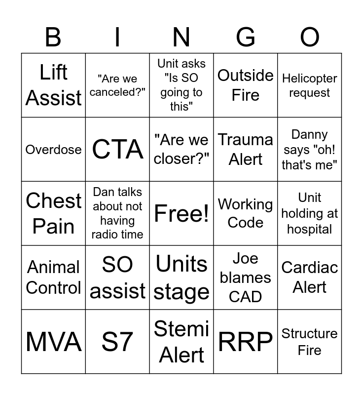 This bingo card has a free space and 24 words: MVA, SO assist, "Are we closer?", RRP, Helicopter request, Lift Assist, "Are we canceled?", Unit asks "Is SO going to this", Working Code, Unit holding at hospital, Chest Pain, CTA, Joe blames CAD, Cardiac Alert, Overdose, S7, Stemi Alert, Outside Fire, Danny says "oh! that's me", Animal Control, Dan talks about not having radio time, Units stage, Trauma Alert and Structure Fire.