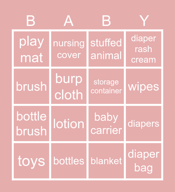 This bingo card has 17 words: blanket, toys, stuffed animal, play mat, lotion, diaper rash cream, diapers, storage container, wipes, burp cloth, bottles, baby carrier, brush, nursing cover, bottle brush, pacifier and diaper bag.