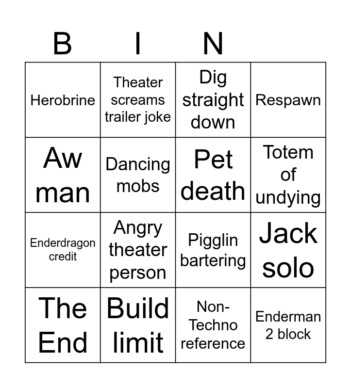 This bingo card has 16 words: Build limit, Jack solo, Dig straight down, Herobrine, Enderdragon credit, Theater screams trailer joke, Pigglin bartering, Non-Techno reference, Aw man, Dancing mobs, The End, Respawn, Angry theater person, Totem of undying, Pet death and Enderman 2 block.